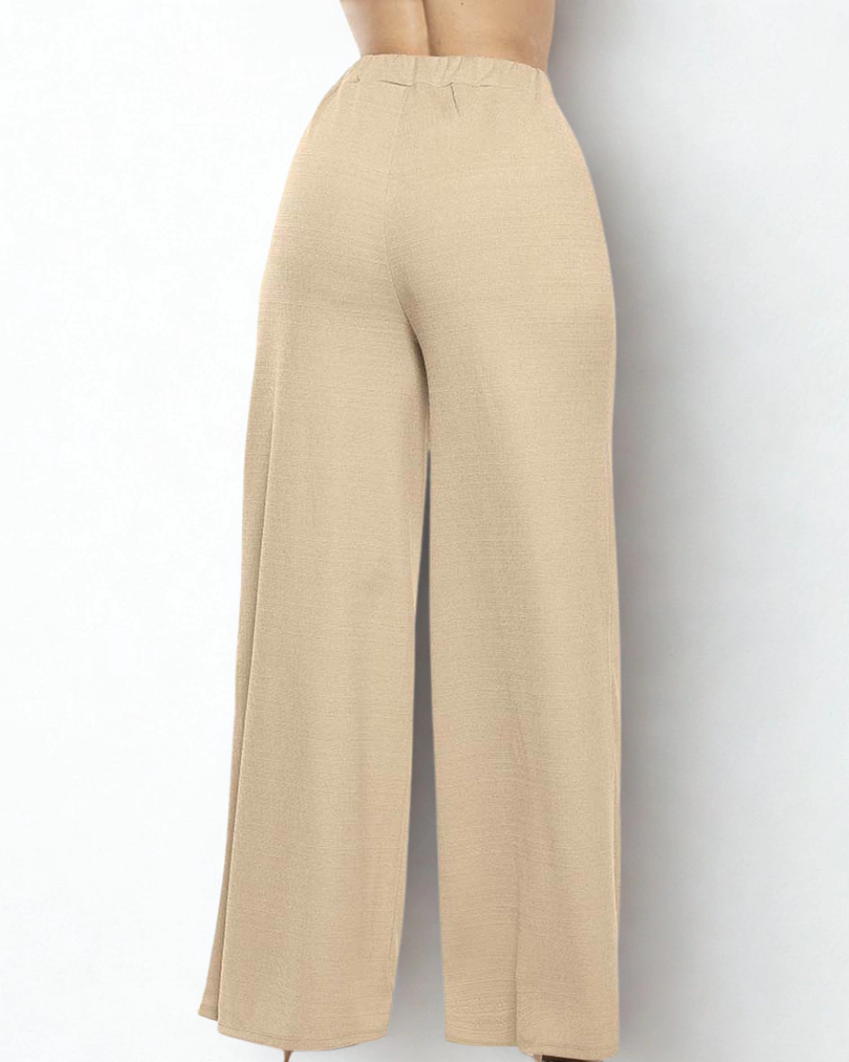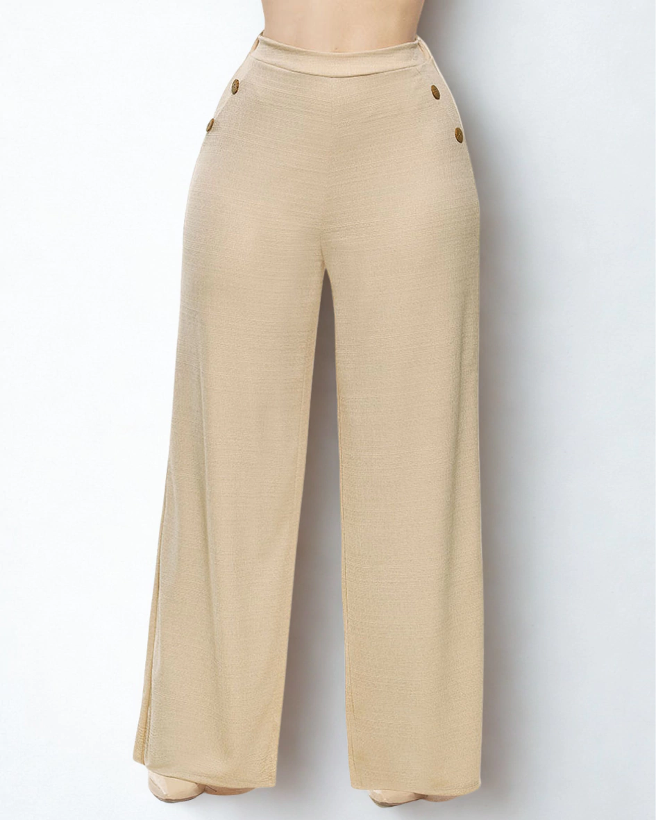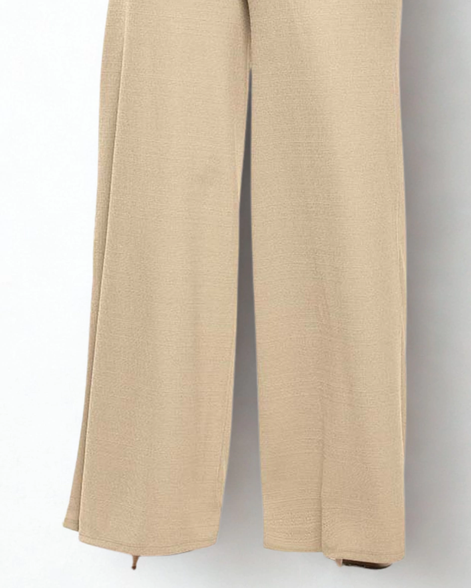 Modelagem Pantalona: Ampla desde o quadril até a barra, proporciona fluidez e um caimento elegante que alonga a silhueta.
