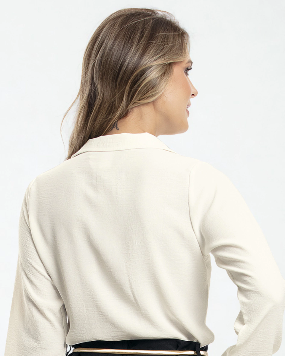 Com design atemporal e acabamento impecável, esta camisa off-white é uma peça curinga que traz elegância, conforto e versatilidade para o guarda-roupa feminino.