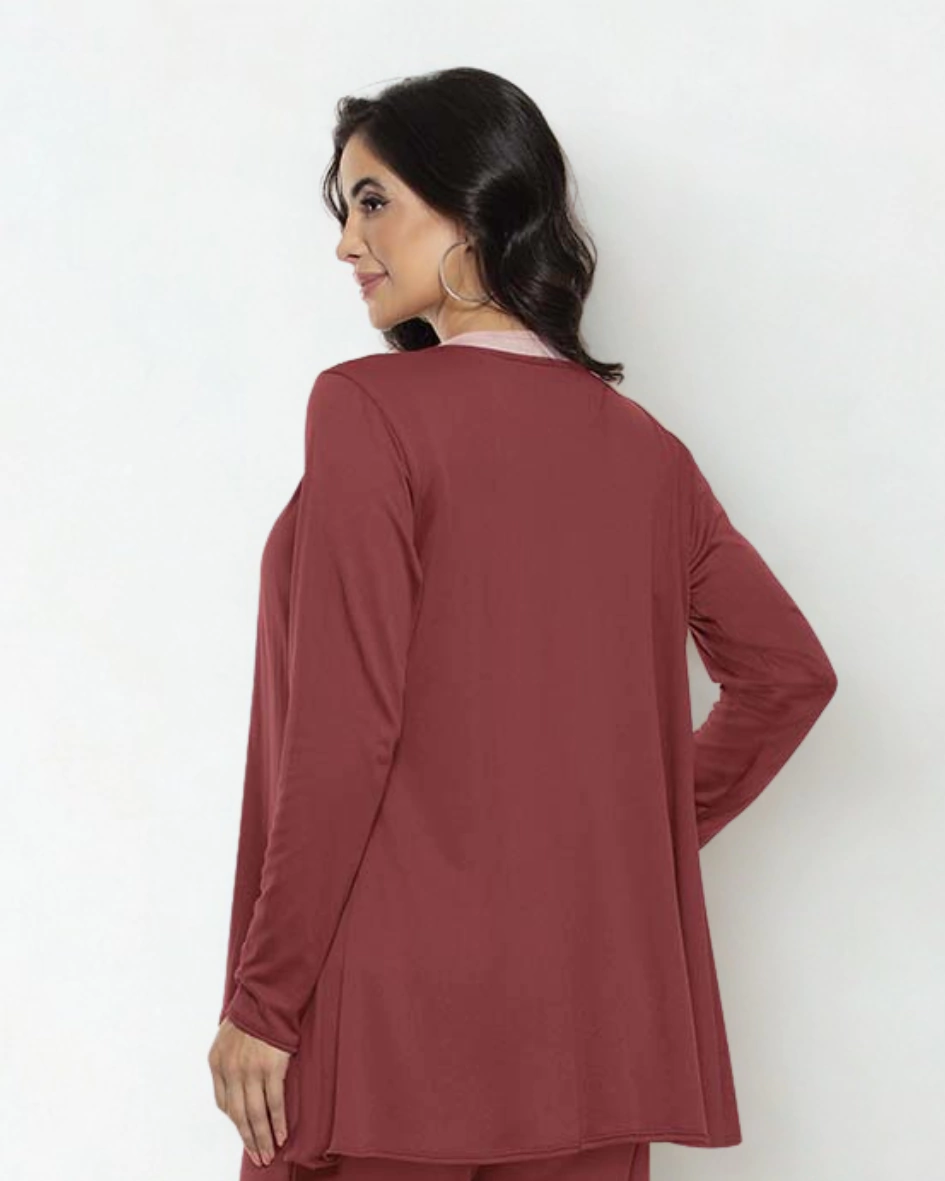 Com seu corte fluido e comprimento alongado, este cardigan é a peça perfeita para compor produções elegantes e confortáveis, mantendo o equilíbrio entre praticidade e estilo em todas as ocasiões.