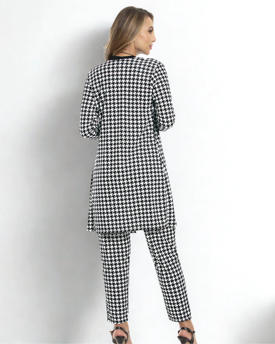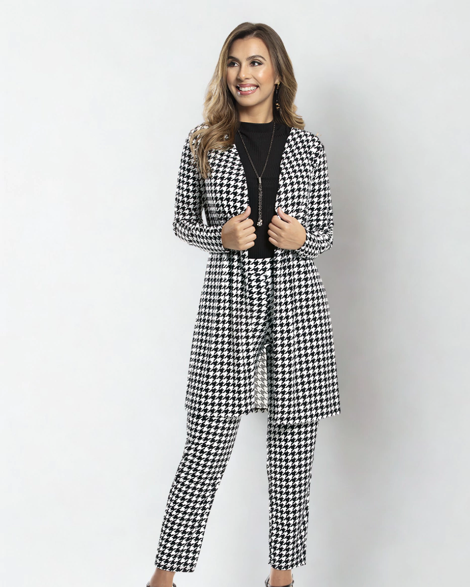 Estampa Pied-de-Poule: Clássica e sofisticada, a padronagem em preto e branco traz um toque atemporal e marcante ao look.