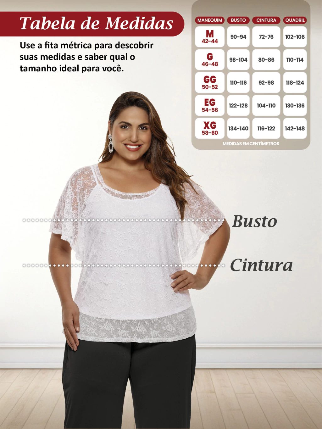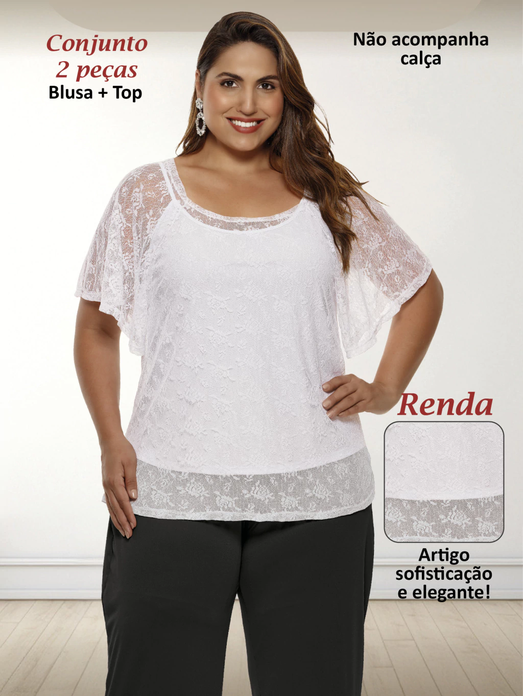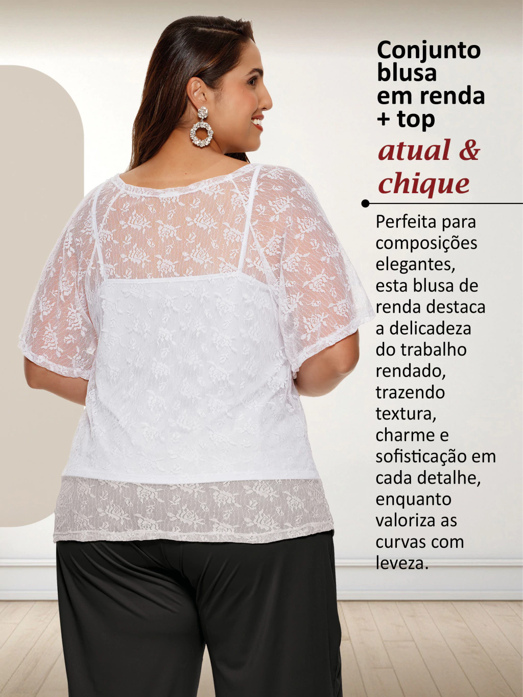 Conjunto com Bata em Renda e Blusa Interna – Moda Plus Size Ref.: 558265 Cor: Branco Com design elegante e totalmente voltado ao conforto, este conjunto plus size une a leveza da renda à praticidade da helanca, criando uma proposta sofisticada e versátil para diversas ocasiões. A sobreposição destaca a feminilidade da peça, garantindo caimento fluido, visual delicado e perfeito acabamento para quem busca uma produção charmosa e funcional. Decote: O decote redondo presente tanto na bata quanto na blusa interna traz equilíbrio ao conjunto, oferecendo conforto e valorizando o colo de maneira sutil e sofisticada. Busto: O busto conta com estrutura confortável, especialmente na blusa interna, que oferece segurança e estabilidade ao vestir. A renda sobreposta adiciona textura e elegância, criando um efeito visual delicado e moderno. Mangas: As mangas curtas da bata apresentam leve transparência e caimento fluido, proporcionando movimento sutil e reforçando a feminilidade da peça com um toque romântico. Modelagem: A combinação da bata com a blusa interna cria um visual versátil, com sobreposição que alonga a silhueta e adiciona profundidade ao look. A alcinha da blusa interna traz leveza e praticidade ao conjunto. Tecido: Renda: Delicada e arejada, a renda adiciona textura e sofisticação, garantindo visual refinado e elegante. Helanca: Leve, confortável e com excelente elasticidade, a helanca proporciona ajuste natural ao corpo e conforto prolongado ao longo do dia.