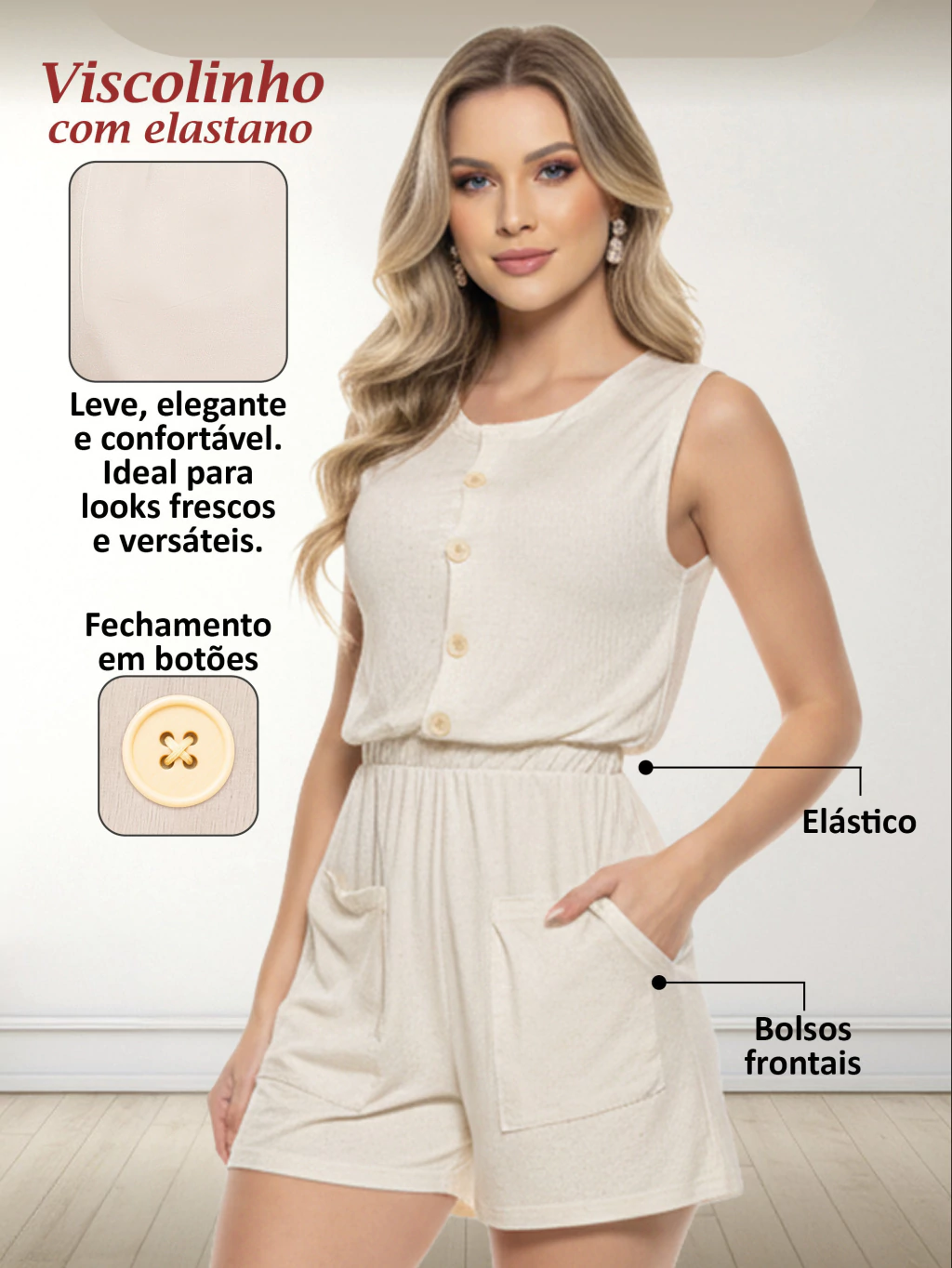 Macaquinho com Botões e Bolsos Frontais – Moda Feminina Ref.: 713236 Cor: Off-white Confortável, leve e extremamente versátil, este macaquinho em viscolinho com elastano foi desenvolvido para oferecer praticidade e elegância em uma única peça. Sua modelagem com efeito blousê e detalhes funcionais tornam o modelo ideal para composições descontraídas, passeios ao ar livre e looks casuais sofisticados. Decote: O decote redondo proporciona um visual clássico e equilibrado, valorizando o colo de maneira discreta e elegante. Busto: Com modelagem reta e confortável, o busto acompanha o corpo com suavidade, garantindo liberdade de movimento e ótimo caimento. Mangas: O modelo sem mangas oferece frescor e praticidade, tornando a peça perfeita para dias quentes e permitindo combinar acessórios com facilidade. Cintura: O elástico na cintura cria um efeito blousê, proporcionando ajuste confortável e equilibrando a transição entre o busto leve e o short mais estruturado. Short: O short possui caimento solto e bolsos frontais amplos, que adicionam funcionalidade e estilo ao modelo. A praticidade dos bolsos é ideal para acomodar pequenos objetos sem perder elegância. Tecido Viscolinho com Elastano: Com toque natural, textura sofisticada e excelente caimento, o viscolinho com elastano oferece frescor, leve elasticidade e conforto durante todo o dia. É ideal para composições leves e elegantes.