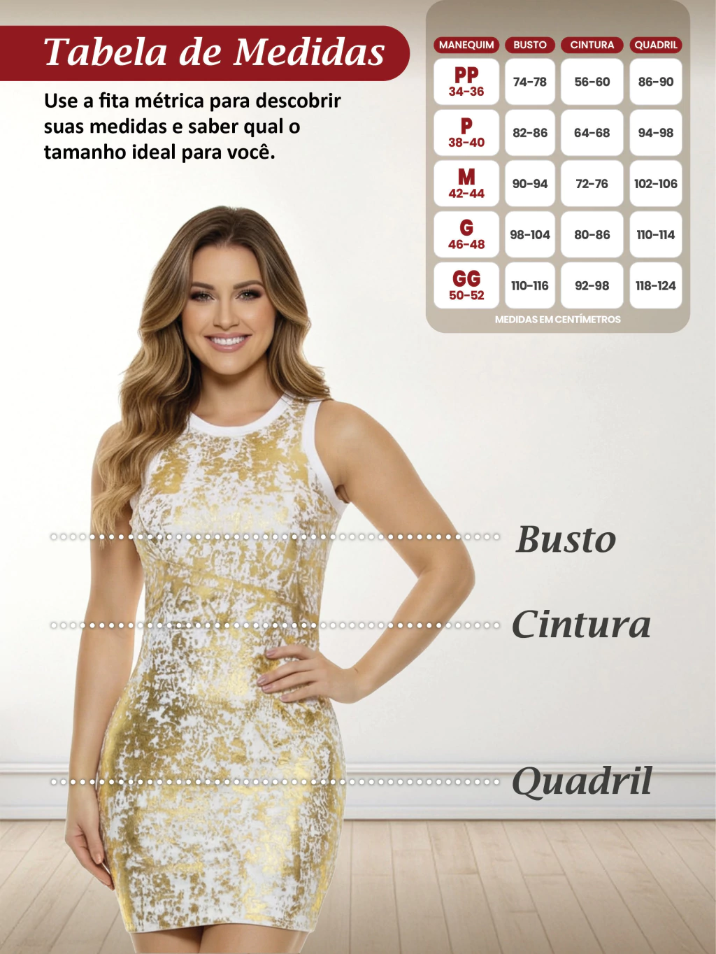 Vestido Básico com Foil e Saia Justa – Moda Feminina Ref.: 710709 Cor: Branco e dourado Comprimento: Básico Moderno e cheio de personalidade, este vestido em malha canelada com aplicação de foil foi desenvolvido para quem busca um visual marcante, atual e confortável. O efeito metálico cria destaque imediato, tornando a peça perfeita para ocasiões especiais ou produções noturnas com toque fashion. Decote: O decote redondo traz equilíbrio ao visual e proporciona um acabamento clássico que valoriza o colo de maneira discreta e elegante. Busto: Com modelagem ajustada, o busto acompanha o corpo com conforto, garantindo sustentação leve e um caimento alinhado, sem comprometer a mobilidade. Mangas: O modelo sem mangas oferece frescor e liberdade de movimento, reforçando o estilo moderno e clean da peça. Cintura: A modelagem levemente acinturada realça a silhueta com naturalidade, criando harmonia entre a parte superior e a saia justa. Saia: A saia justa de comprimento curto valoriza as curvas com elegância, proporcionando um visual sofisticado e contemporâneo, perfeito para quem busca presença e estilo. Tecido Malha Canelada com Foil: A malha canelada garante elasticidade, conforto e excelente adaptação ao corpo, enquanto a aplicação de foil dourado acrescenta brilho metálico e modernidade, transformando o vestido em uma peça de destaque. Um vestido ousado, moderno e elegante, ideal para composições que pedem brilho, estilo e conforto em uma única peça.