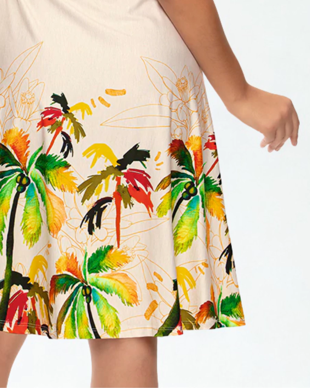 Estampa Barrada: Padronagem tropical concentrada na barra da saia, conferindo um contraste vibrante e alegre que destaca a peça com estilo.