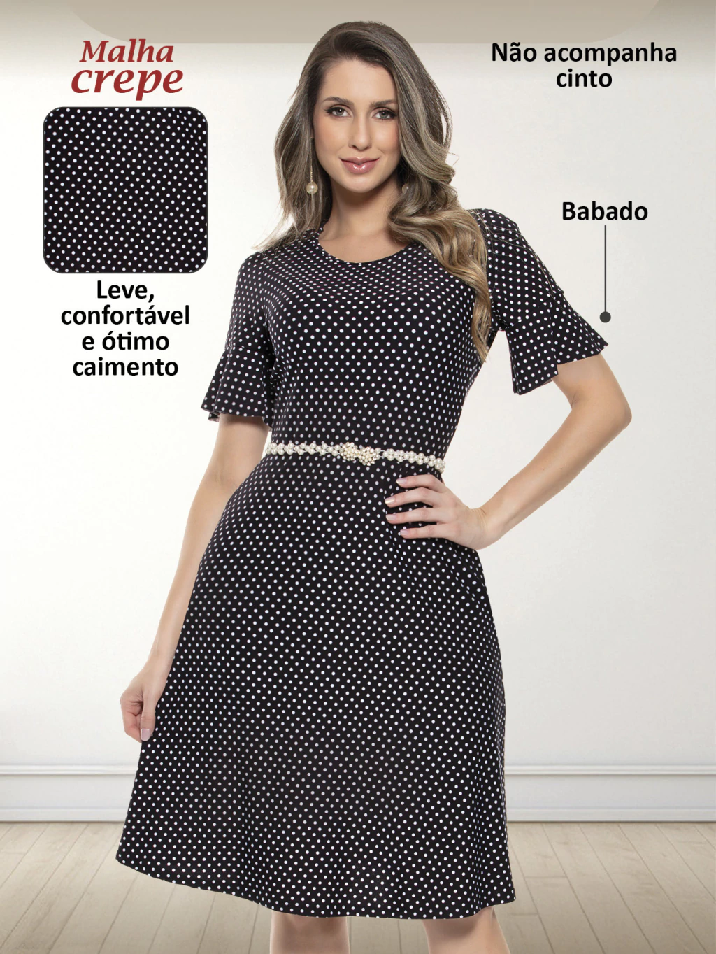 Vestido Clássico com Mangas Sino e Saia Evasê – Moda Feminina Ref.: 606286 Cor: Preto e branco Comprimento: Clássico Elegante, confortável e cheio de charme, este vestido em malha crepe combina fluidez e sofisticação em uma peça versátil para diversas ocasiões. A estampa poá clássica reforça o apelo atemporal do modelo, enquanto sua modelagem delicada valoriza a silhueta de forma natural. Decote: O decote redondo traz um acabamento tradicional e equilibrado, garantindo conforto e versatilidade ao visual. Busto: Com caimento suave e estruturado, o busto acompanha as linhas do corpo sem marcar, mantendo a fluidez característica da malha crepe. Mangas: As mangas sino adicionam movimento e um toque romântico à peça, criando um visual delicado e elegante. Saia: A saia evasê oferece movimento leve e fluido, valorizando o caimento e proporcionando conforto em todas as ocasiões. Tecido Malha Crepe: Com textura leve, toque suave e excelente caimento, a malha crepe proporciona conforto ao vestir e mantém a elegância do modelo, além de ser prática e versátil para o dia a dia. Um vestido clássico e encantador, perfeito para quem busca uma peça feminina, confortável e com estilo atemporal.