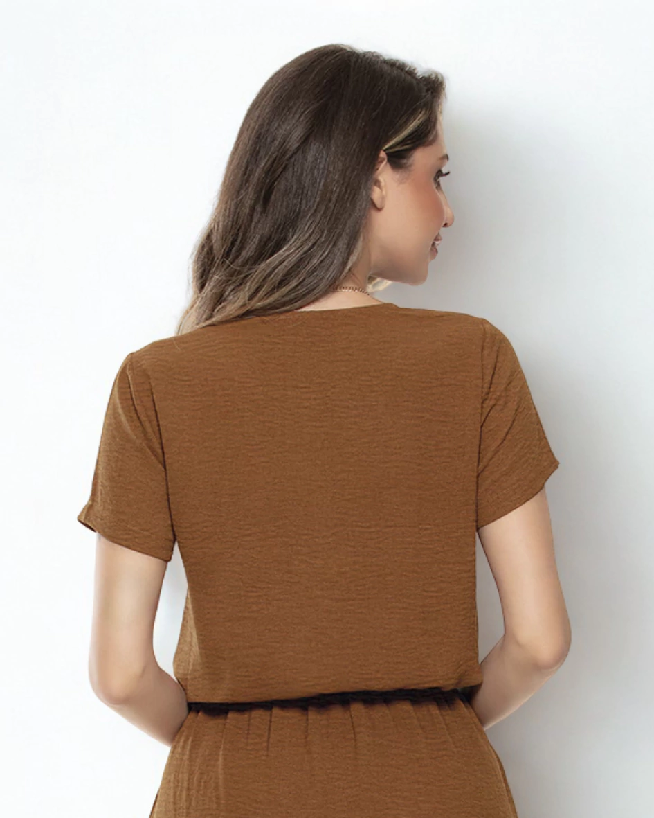 Modelagem Blousê: Cria um efeito soltinho e fluido na parte superior, proporcionando leveza e conforto sem perder a sofisticação.