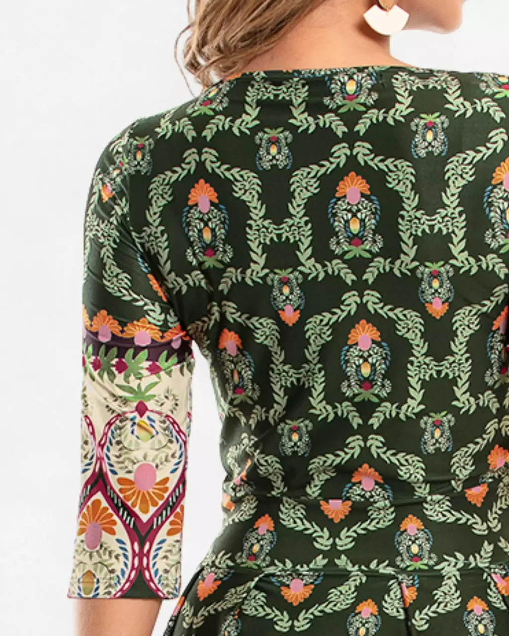 Decote redondo: clássico e elegante, valoriza o colo com discrição.