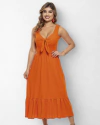 Este vestido longo em liganette une conforto, estilo e sofisticação. A modelagem maxi alonga a silhueta, enquanto os detalhes como fendas laterais, babado e faixa criam um visual delicado e moderno, perfeito para ocasiões que pedem elegância com liberdade de movimentos.