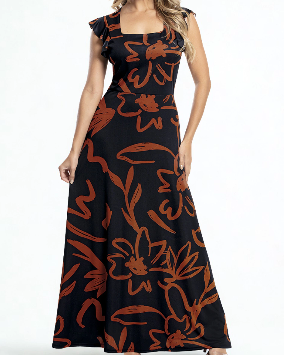 Um vestido longo versátil e elegante, que une feminilidade, conforto e presença, perfeito para quem busca estilo e caimento impecável.