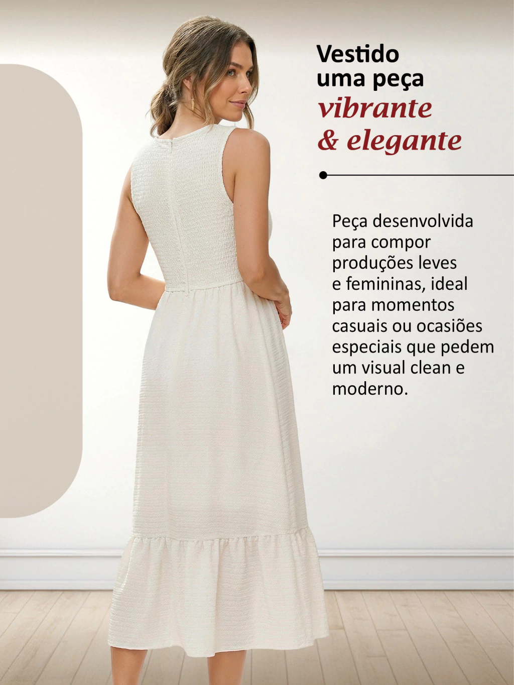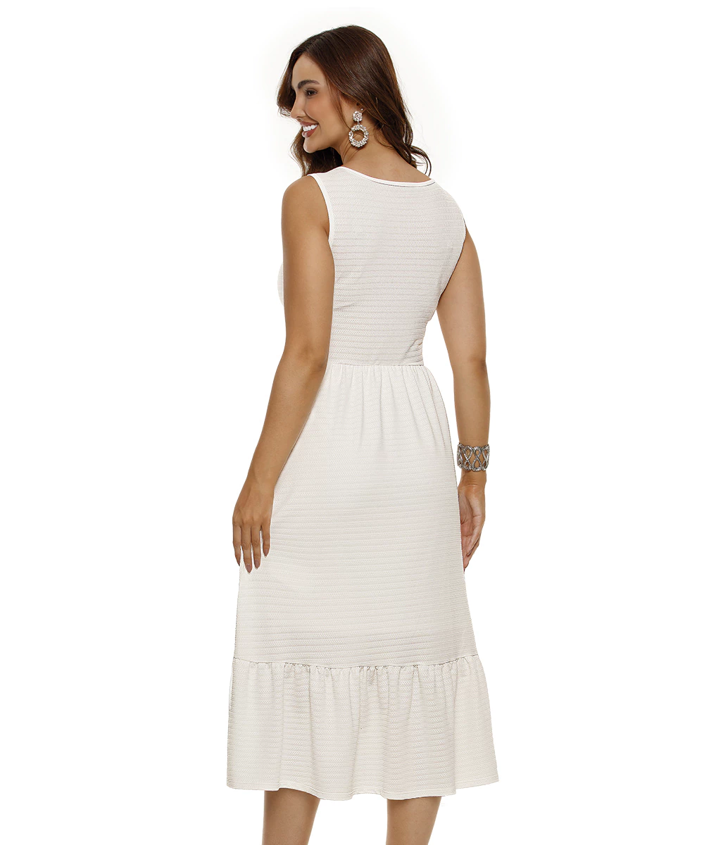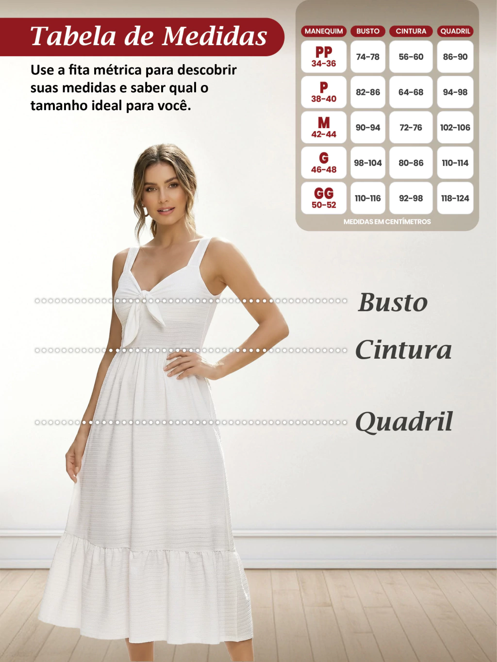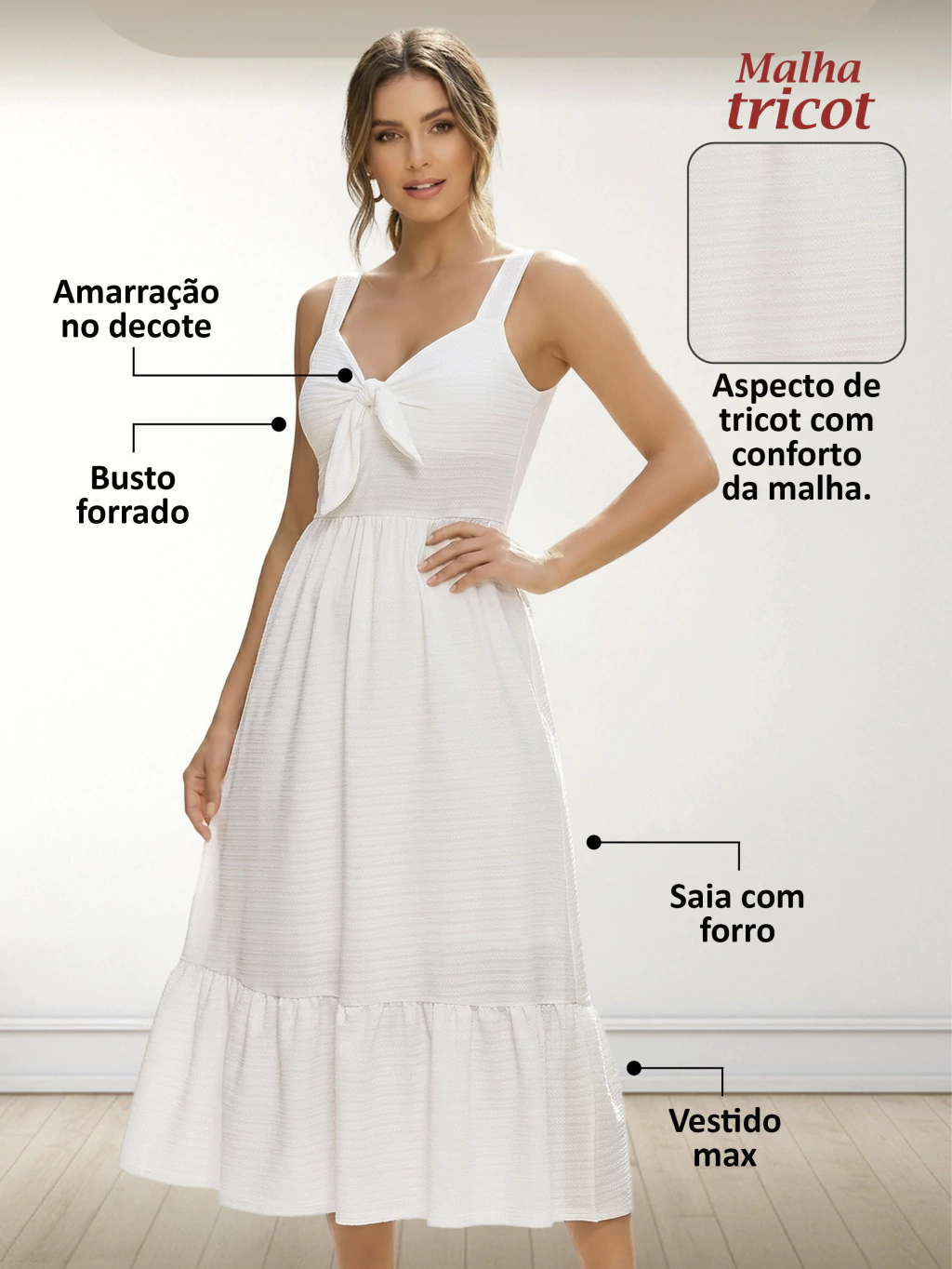 Vestido Max com Amarração no Decote e Saia Evasê – Moda Feminina Ref.: 709247 Cor: Off-white Comprimento: Max Delicado e versátil, este vestido longo em malha tricot foi desenvolvido para oferecer conforto, elegância e um caimento impecável. A combinação da textura do tecido com a modelagem fluida cria um visual leve e refinado, perfeito para ocasiões especiais, eventos ao ar livre ou composições casuais mais sofisticadas. Decote: O decote em “V” com amarração frontal acrescenta charme e feminilidade à peça. O detalhe do laço permite ajuste suave, criando um ponto focal elegante e moderno. Busto: O busto forrado oferece sustentação, segurança e excelente acabamento, garantindo que a parte superior do vestido mantenha seu caimento estruturado durante todo o uso. Alças: As alças largas proporcionam mais conforto e estabilidade, equilibrando perfeitamente o decote profundo e oferecendo suporte adicional. Saia: A saia evasê de comprimento longo possui babado na barra, criando movim