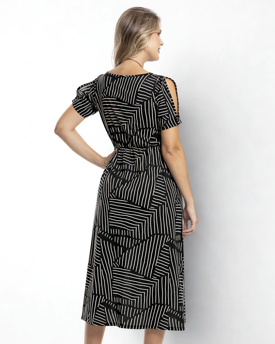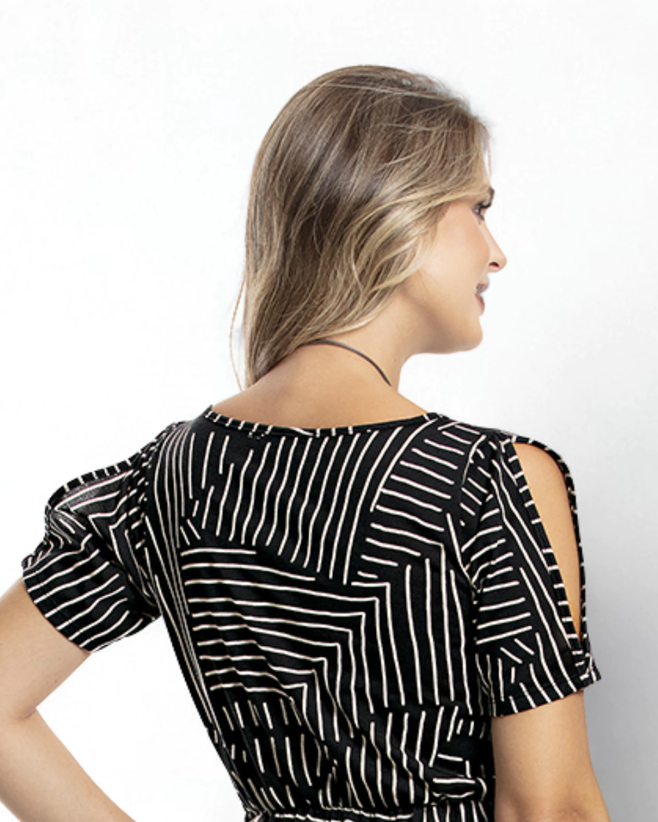 Cor Preto com Estampa Geométrica: moderna e sofisticada, trazendo presença e estilo ao visual.