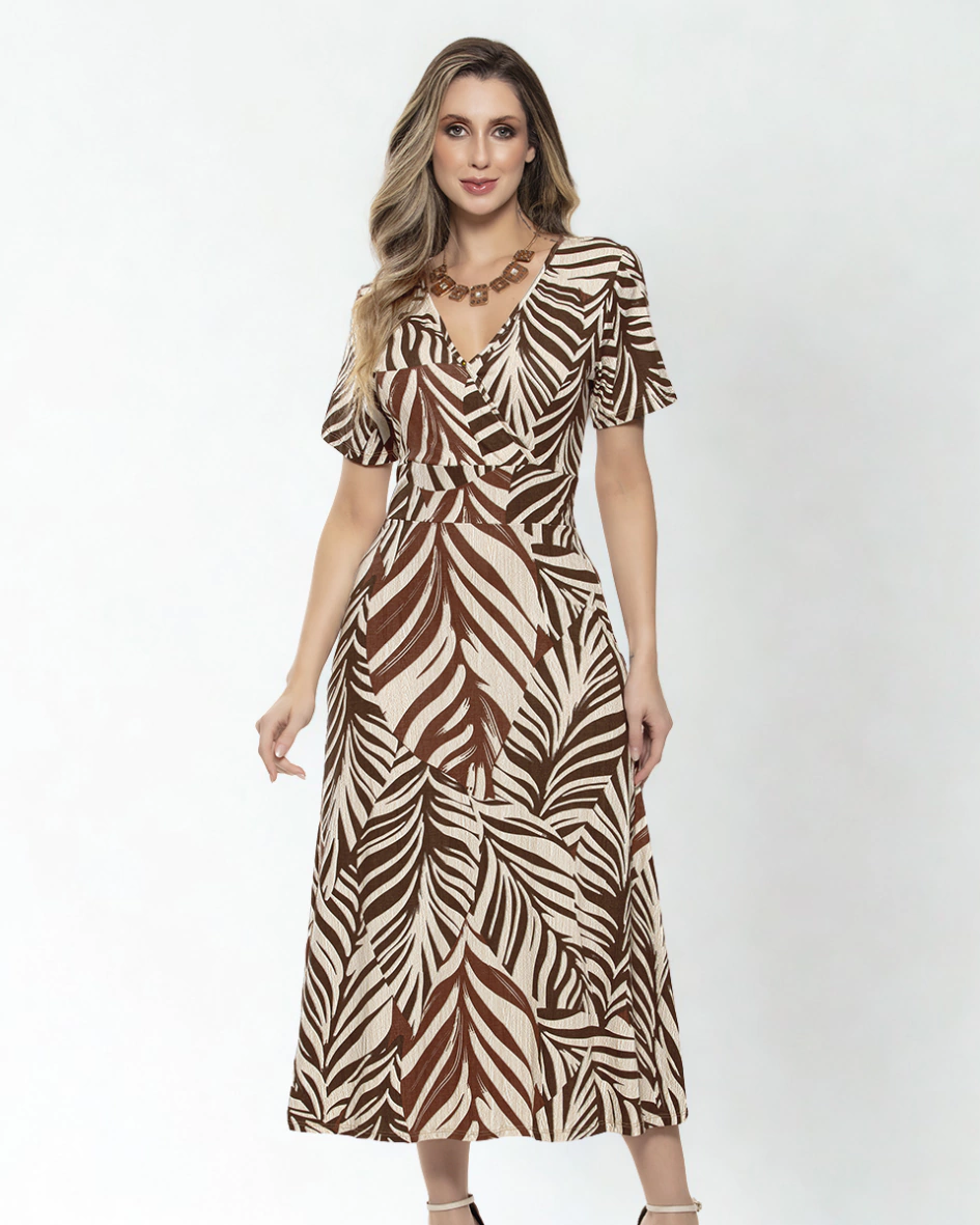 Este vestido max transpassado é a tradução da feminilidade moderna. Com estampa tropical e caimento fluido, ele une charme, conforto e versatilidade, sendo perfeito para qualquer ocasião em que se deseja estar bem-vestida com leveza e estilo.