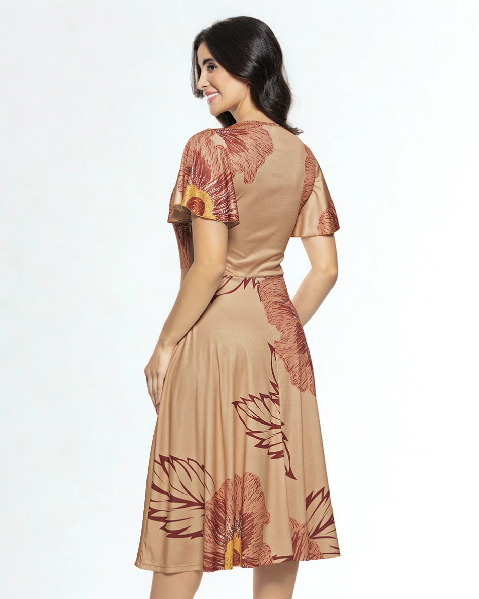 Um vestido midi elegante e modesto, que une feminilidade, conforto e sofisticação, perfeito para ocasiões especiais ou para o dia a dia com estilo discreto.